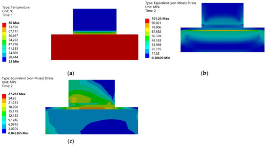 The temperature distribution diagram (a), the thermal stress distribution image (b), and the equivalent stress cloud image of the Si-Ti/Cu/Ti/Au-D (c).