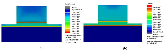 In this study, constant amplitude loading was employed, using the Hybrid Load Provider to construct a load spectrum combining thermal stress, shear forces, and temperature loads. The results of temperature stress and shear stress were imported into nCode DesignLife software, corresponding S-N curves were added for each material, and the Hybrid Load Provider method was used to simulate the alternating load of temperature and thermal stress [32]. Following reliability virtual fatigue analysis [33], the cloud maps of fatigue life and cumulative fatigue damage of the Si-Ti/Cu/Ti/Au-D structure are shown in Figure 14. Based on the fatigue life plot in Figure 14a, the minimum life is 21,340 cycles. As depicted in the fatigue damage cloud plot in Figure 14b, the earliest occurrence of fatigue failure in the Si-Ti/Cu/Ti/Au-D structure is located within the Ti layer.