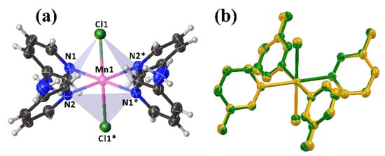 (a) View of the individual molecule of [MnCl2(3AP)4] and (b) overlays of [MnCl2(3AP)4] (green) and [MnBr2(3AP)4] (orange). Thermal ellipsoids are drawn with a 50% probability, and symmetry-related positions are indicated with the symbol *.