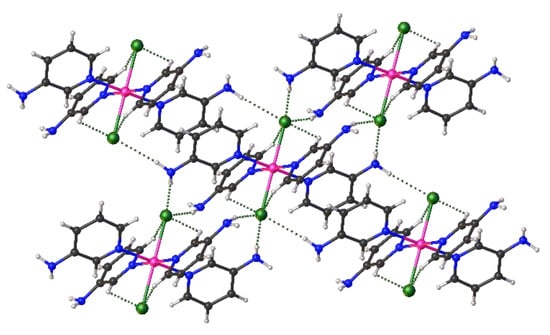 While attempting to construct 1D coordination polymers with 3AP and manganese(II) chloride or manganese(II) bromide, two isomorphic complexes with the triclinic Pī space group (Table 1) were obtained. These complexes had the formula [MnX2(3AP)4], and to simplify the description, only [MnCl2(3AP)4] was discussed with the respective distances for the bromine analog. In the asymmetric unit, the manganese ion is located in an inversion center and, as a result, the asymmetric unit contains only one halide atom and two 3AP ligands. Both complexes have the same trans-octahedral coordination, with four 3AP ligands coordinated in the equatorial position and two halide atoms coordinated in the axial position (Figure 1a). An overlay of [MnX2(3AP)4] showed minimal differences with the rms of 0.0746 (Figure 1b). The coordination is best described as an elongated octahedron because the Mn-Cl and Mn-Br distances (2.561(2) Å and 2.7304(3) Å, respectively) are longer than the average Mn-N distances in both complexes (2.31 Å). It should be noted that three other structures similar to [MnX2(3AP)4] were found in the CSD database with MnCl2 and pyridine [21], MnCl2 and nicotinic acid [22], and MnBr2 and 3-cyanopyridine [23]. Additionally, two isomorphs with cadmium [24] ([CdCl2(3AP)4]) and cobalt [25] ([CoCl2(3AP)4]) were found in the CSD database. Only the pyridine nitrogen atom was coordinated to the manganese ion, while the amino atom assisted crystal packing by hydrogen bonding (Figure 2). The three weak hydrogen bonds observed in both isomorphic structures were longer than the sum of the van der Waals radii of nitrogen and the halide (N-3A…X1, N-3B…X1, and N-4A…X1; Table 2). These weak hydrogen bonds are the same as those observed in [CdCl2(3AP)4] and [CoCl2(3AP)4], which exemplify the importance of weak interactions in the crystal lattice. Potentially, another isomorphic structure of [MX2(3AP)4] can be obtained with Fe2+. One tool that can be used to compare hydrogen bonds from N-H groups is infrared spectroscopy (IR) [26]. Our results show near-identical IR spectra for [MnX2(3AP)4] (Figure S1), with the main difference being a shift of symmetric N-H stretching at 3372 cm−1 in the chloride complex as compared to 3384 cm−1 in bromide. In summary, IR indicates the same molecular framework in both structures with slightly different hydrogen bonding results due to the molecular difference between chlorine and bromine.