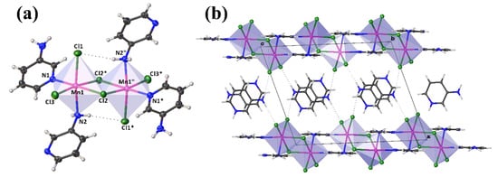 Using 3AP with the addition of an equimolar amount of hydrochloric acid during the reaction allows the synthesis of a layered 2D structure with the formula [MnCl33AP]−[3APH]+ (Figure 3a). This structure has two independent layers (Figure 3b). The first layer is a 2D coordination polymer with the asymmetric unit containing one manganese(II) ion, one 3AP ligand, and three chlorine ions ([MnCl33AP]−). The second layer has 3APH+ acting only as a cation to balance the overall charge. The coordination sphere around the manganese(II) ion has four chlorine and two nitrogen atoms. The first nitrogen atom comes from the pyridine ring in 3AP (N1), and the second one from an amino group (N2) in a different 3AP molecule (Figure 2a). One of the chlorine ions (Cl2) is duplicated by an inversion center and acts as a bridge to a second manganese ion (Figure 2a). Unlike the 0D unit, 3AP bridges different manganese ions resulting in a 2D coordination polymer. In summary, the 2D layer is constructed by a manganese trichloride dimer that is bridged by 3AP ligands, as it can be seen on top of this layer (Figure S4). A similar coordination sphere was previously discovered with 2-aminopyridine [27], although this compound crystallized in 1D chains. To the best of our knowledge, [MnCl33AP]−[3APH]+ represents the first 2D coordination polymer reported with manganese(II) chloride and a nitrogen-based ligand. Finally, the synthesis of the bromine analog [MnBr33AP]−[3APH]+ was not possible in a number of different reaction conditions.
