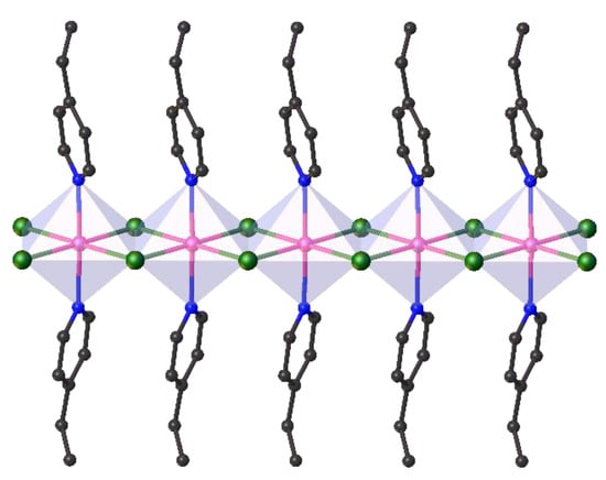 Surprisingly, using 4-ethylpyridine (4EtP) in the same reaction conditions as 3AP led to the formation of 1D chain structures with the formulas {MnCl2(4EtP)2}n and {MnBr2(4EtP)2}n (Figure 4). These 1D chain structures were isomorphic with the C2/c space group (Table 1). To simplify the description, only {MnCl2-(4EtP)2}n was discussed with the respective distances for the bromine analog. A trans-octahedral coordination around the manganese ion was observed, with two 4EtP ligands coordinated in axial positions, and four halide atoms coordinated in the equatorial plane, each of them bridging a separate manganese ion in an edge-sharing fashion (Figure 4). The coordination polyhedron is best described as a elongated octahedron as the Mn-N distance is shorter than the Mn-X distance. In the asymmetric unit, the manganese ion is located in a C2 axis that reproduces 4EtP by symmetry. On the other hand, the halide is located near an inversion center, and it is reproduced by the C2 axis and inversion center. As a result, the asymmetric unit contains three components: one 4EtP ligand, one manganese center, and one halide. Despite the highly symmetrical nature of these 1D chain structures, only three other structures with similar 1D chains were found in the literature: benzotriazole [28], benzo-2,1,3-selenenadiazole [29], and 3-cyanopyridine [23]. As expected, similar IR and Raman spectra were observed in these 1D chains (Figures S2 and S3), indicating the same framework.