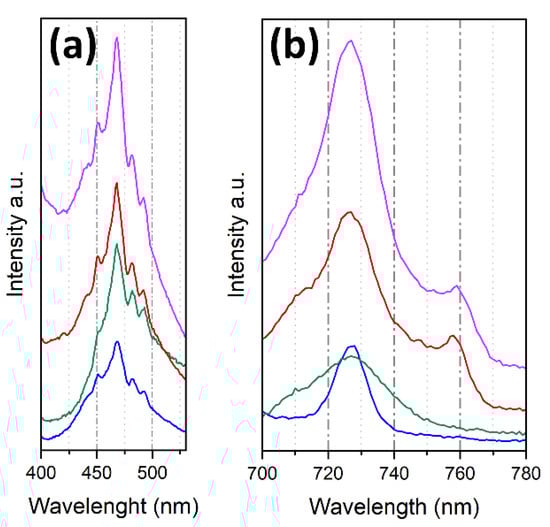 In the solid state, the 0D and 1D materials studied had very similar broad photoluminescence (PL) values from 400 to 550 nm (Figure 5a), with the maximum emission at 468 nm, and near-identical peak patterns. Unexpectedly, the 2D material [MnCl33AP]−[3APH]+ lacked any relevant PL when compared to the rest of the materials. The main differences between the 0D and 1D materials were observed in the NIR region. There was an additional emission band at 760 nm observed in the 1D chains that was absent from the 0D units (Figure 5b).