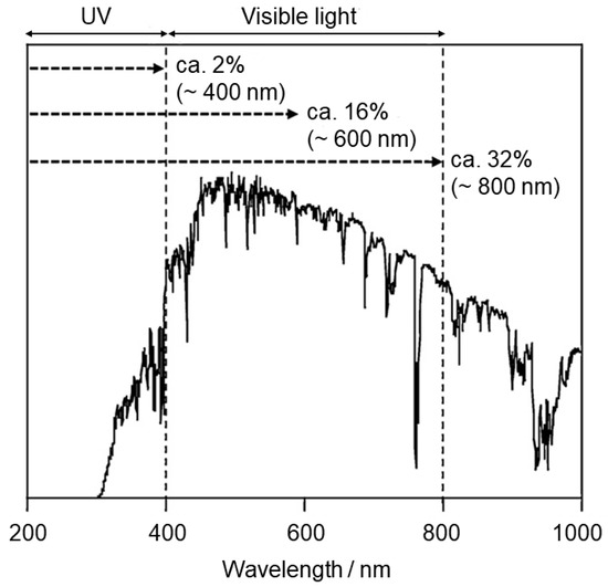 However, to better utilize light (solar or artificial cheap sources, e.g., light-emitting diodes (LEDs)) and thus increase photocatalytic efficiency, it is necessary to overcome the weak points of titania. The first is the relatively wide band gap of TiO2 (3.0–3.2 eV), which only corresponds to the photoabsorption of UV light. As this has been calculated in Abe’s review, if all UV light (in solar spectrum) up to 400 nm were utilized, the solar light conversion efficiency for photocatalytic water splitting would only be 2% [4]. The possibility of utilizing visible light up to 600 nm or 800 nm will lead to efficiencies of 16% and 32%, respectively (Figure 1). The second limitation is the recombination of photogenerated charge carriers (electrons and holes), which reduces overall quantum efficiency [6]. During the recombination process, the excited electron reverts to the valence band without reacting to adsorbed species.