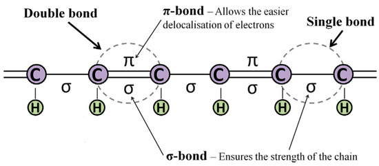 Polyaniline (PANI) is an example of a polymer belonging to the conducting polymer (CP) group. One can classify this group as containing electrically conducting organic polymeric compounds. Other examples of CPs are polypyrrole (PPy), polythiophene (PTh), poly(3,4-ethylenedioxythiophene) (PEDOT) and polyacetylene (PAc). CPs can act as a semiconductor or a conductor. These compounds are conjugated and show π electron delocalization along their polymer backbone. This main property determines their unique electrical and optical properties [26,28,29,30,31]. The conjugated structure of CPs is a necessary condition for the formation of delocalized electronic states. The degree of delocalization influences the value of band gap energy, which determines the conductivity of CPs. Single and double bonds contain a localized σ-bond (chemically strong). In the case of double bonds, it is also possible to distinguish a localized π-bond (less strong than the σ-bond). Therefore, π-bonds are responsible for an easier delocalization of electrons (Figure 2) [29,32].