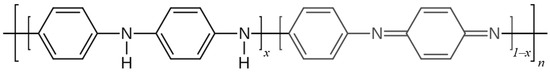 PANI has many advantages, such as its low cost, its high environmental stability and its ability to enact electric switching between its conductive and resistive states via doping processes; it is important to emphasize that PANI is characterized by its diversity of structural forms [33]. Polyaniline is a mixed oxidation state-conducting polymer, which consists of reduced benzenoid amine units (–NH–) and oxidized quinoid imine units (=N–) (Figure 3). PANI’s average oxidation state is denoted as 1 − x. When 1 − x = 0 PANI exists as fully reduced leucoemeraldine (LE). If the value 1 − x is equal to 0.5, the half-oxidized emeraldine base (EB) is present. The fully oxidized form of PANI is pernigraniline (PE) when 1 − x = 1 [28,34].