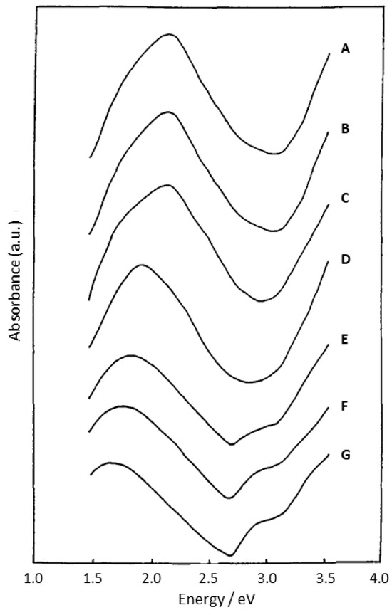 Changes in the photoabsorption properties of PANI (emeraldine base) during its protonation: (A) pH 6, 16 h; (B) 10−4 M HCl, 24 h; (C) 2 × 10−4 M HCl, 3 h; (D) 4 × 10−4 M HCl, 4.5 h; (E) 6 × 10−4 M HCl, 2 h; (F) 8 × 10−4 M HCl, 16 h; (G) 10−3 M HCl, 2 h. Reprinted with permission from [34]. Copyright 1993, Elsevier.