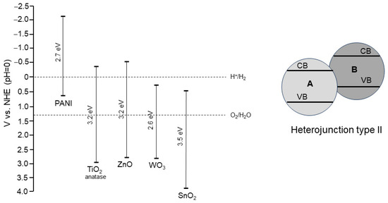 Band positions and band gap energies of PANI and exemplary n-type metal oxide semiconductors. Data collected from [43,44] (left). Symbolic presentation of a type II heterojunction system of coupled semiconductors; A—TiO2, B—PANI (right).