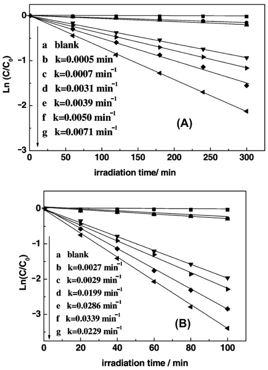 Plots of the photodegradation of (A) methylene blue and (B) Rhodamine B over PANI/TiO2 photocatalysts under visible light irradiation with λ > 450 nm: (a) blank, (b) TiO2, (c) mechanical mixture of PANI and TiO2 (3:100), (d) PANI (1.0%)/TiO2, (e) PANI (5.0%)/TiO2, (f) PANI (2.0%)/TiO2, (g) PANI (3.0%)/TiO2. Reprinted with permission from [57]. Copyright 2008, American Chemical Society.