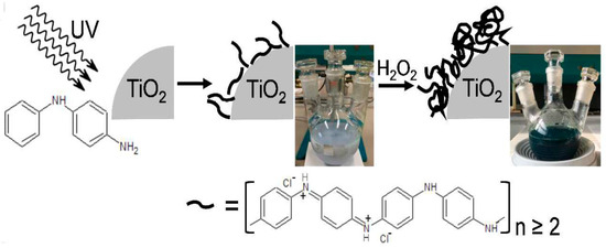 A much smaller number of papers consider other preparation methods. Some reports include PANI and TiO2 impregnation procedures [58,59,60,61]. A novel, green and promising procedure for the preparation of PANI/TiO2 was proposed by Cionti et al. [62]. Figure 7 shows the main steps of this procedure: (1) UV light-mediated growth of PANI oligomers on a TiO2 surface, (2) polymerization of the oligomers with H2O2.