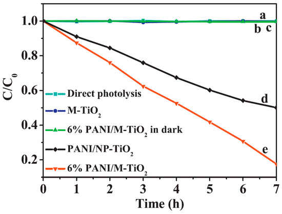 Photocatalytic degradation of 4-chlorophenol under visible light irradiation (λ > 400 nm); (a) direct photolysis, (b) M(mesoporous)-TiO2, (c) 6% PANI/M-TiO2 in the dark, (d) PANI-NP-TiO2, (e) 6% PANI/M-TiO2. Reprinted with permission from [64]. Copyright 2011, Elsevier.