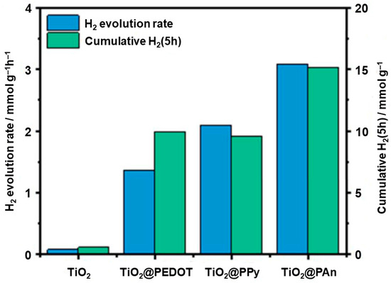 Comparison of TiO2(P25), PEDOT/TiO2, PPy/TiO2, PANI/TiO2 photocatalytic activities in the process of hydrogen evolution [61].