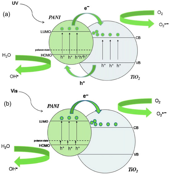 Under visible light irradiation, only the PANI component is excited (Figure 10b). The charge migrates from the HOMO to LUMO of PANI. The excited-state electrons from PANI can then be transferred from the LUMO of PANI to the CB of TiO2. An electron center is formed. Simultaneously, the transitions π → polaron and polaron → π* in PANI are induced. Photogenerated holes in the π orbital of PANI are transferred to the interface and react with water to form hydroxyl radicals. The synergistic effect of PANI and TiO2 is associated not only with visible light sensitization of TiO2 through PANI but also with improved charge separation [87,88].