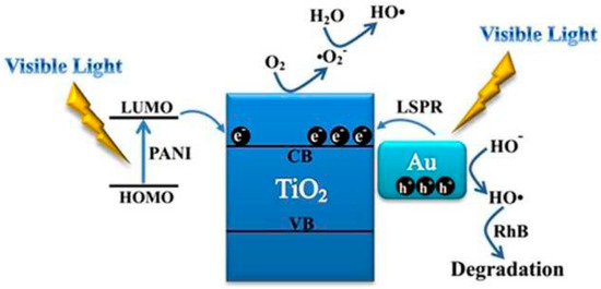 There are also reports of modifications to the PANI–TiO2 binary system. The modification of the mechanism is the result of such a concept. For example, Zhang et al. modified the PANI–TiO2 composite with gold [58]. In this mechanism, additional hot electrons from Au NPs are injected into the CB of titania, inducing a visible-light-mediated surface plasmon resonance (LSPR) mechanism (Figure 11). The presence of Au NPs in this system enhances the charge separation and visible light sensitization effect due to the additional synergy between Au@TiO2 and PANI–TiO2.
