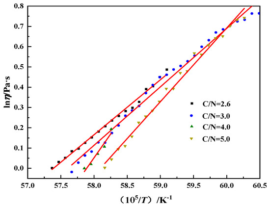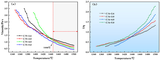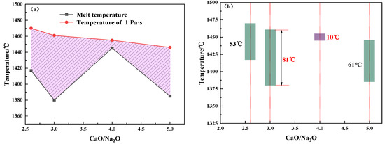 - For CaO/Na2O ratios from 2.6 to 5.0, the viscosity of the modified melting-separated red mud decreases with increasing temperature; the activation energy of the particle movement of the modified melting-separated red mud shows a trend of slowly increasing–sharply increasing–decreasing with increasing CaO/Na2O, which is consistent with the trend of the melting temperature of modified melting-separated red mud.