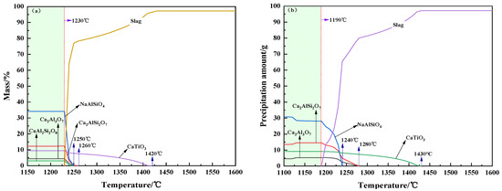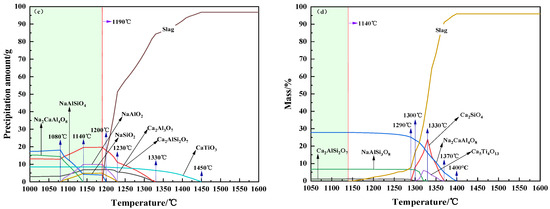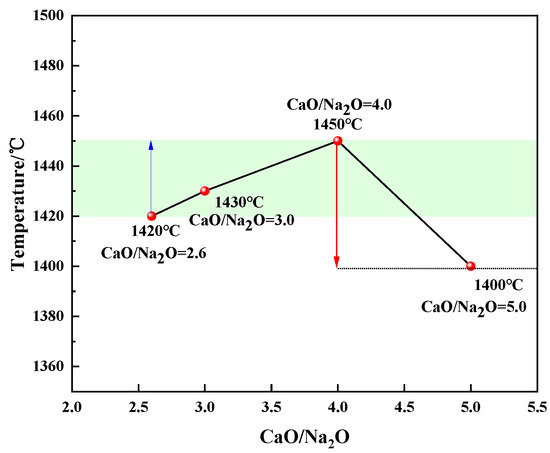 - For CaO/Na2O ratios from 2.6 to 5.0, the precipitated mineral phases of modified melting-separated red mud during the cooling process mainly include nepheline (NaAlSiO4), anorthite (Ca2AlSi2O7, CaAl2Si2O8), perovskite (CaTiO3), melilite (Ca2Al3O7), and albite (Na2CaAl4O8, NaAlSi3O8), and the crystallization temperature first increases and then decreases. When the CaO/Na2O is 4.0, the maximum crystallization temperature of the modified melting-separated red mud during the cooling process is 1450 °C, and the increase in the crystallization temperature of the melt is not significant when the CaO/Na2O increases from 2.6 to 4.0. When the CaO/Na2O is greater than 4.0, the onset crystallization temperature of the melt decreases significantly.