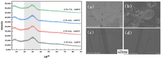 - The suitable fiber-forming temperature interval of modified melting-separated red mud shows a trend of increasing–decreasing–increasing with increasing CaO/Na2O. Considering the feasibility of preparing slag wool from modified melting-separated red mud, the CaO/Na2O ratio in the modified raw material system should not be higher than 3.0.