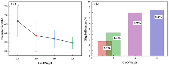 - The slag wool prepared from modified melting-separated red mud with different CaO/Na2O ratios has a smooth surface and a grayish yellow color, and the fibers are arranged crosswise and contain a small amount of slag balls. The diameters of the slag balls are all less than 7 µm, with an average diameter of 5.93 µm, and the slag ball content is 5.83%. With increasing CaO/Na2O, the diameter of the slag wool gradually decreases, but the variation is insignificant, and the slag ball content gradually increases, with a significant increase when the CaO/Na2O is greater than 3.0.