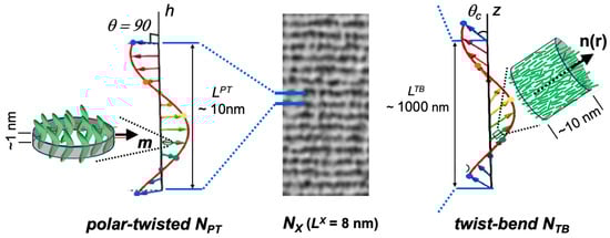 The nanoscale modulation of orientational ordering predicted by the VP polar-twisted nematic model (LPT~10 nm) is much lower because it derives from the local, polar, molecular packing of dimer LCs. The dimers displaying the NX phase have a bent or V-shaped contour with associated polarity (electrostatic and/or shape) and a C2v average molecular symmetry. In the VP simulations, the dimer C2 symmetry axes locally align (Figure 1 Left magnified inset), generating a polar phase director m that roto-translates about a local axis h, yielding a 1D modulation of orientational order with a pitch that is in agreement with experimental observations in the NX phase, i.e., LPT = LX. The polar molecular packing in the polar-twisted phase defining m is unconstrained by elasticity theoretical considerations, and m is free to tightly spiral spontaneously about h to circumvent low-entropy, ferroelectric polarity [,]. Polarity is averaged out over one pitch length in the direction of the modulation, and since both left- and right-handed chiral packing (spirals) are equally probable, in macroscopic regions, the NPT phase is predicted to be uniaxial with balanced chirality as indeed observed experimentally in the NX phase.