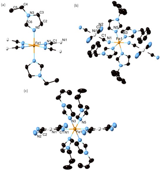 The solid-state IR spectrum of 1 shows one strong peak (2153 cm−1) derived from the C≡N vibrational mode at room temperature (Figure S3) (see Supplementary Materials). The wavenumber of the CN band is higher than that of free [Ni(CN)4]2− (2121 cm−1). This result suggests that all of the CN groups of [Ni(CN)4]2− act as bridging ligands. The spectrum of 2 has two peaks (2139 and 2113 cm−1). These peaks indicate coexisting both bridging bidentate and monodentate ligands, which is consistent with the crystal structure. Compound 3 has three peaks (2158, 2141, and 2120 cm−1) in its spectrum. These three peaks correspond to the three different υ(C≡N) stretching vibrations due to their different coordination environments: a bidentate polymeric structure from –Ni–(C≡N)–Fe–(C≡N)–Ni–, a monodentate structure with a strong C–H⋯N interaction from C–H⋯N(2)≡C(7)–Ni–, and a monodentate structure with weak a C–H⋯N interaction from C–H⋯N(2)≡C(13)–Ni–.