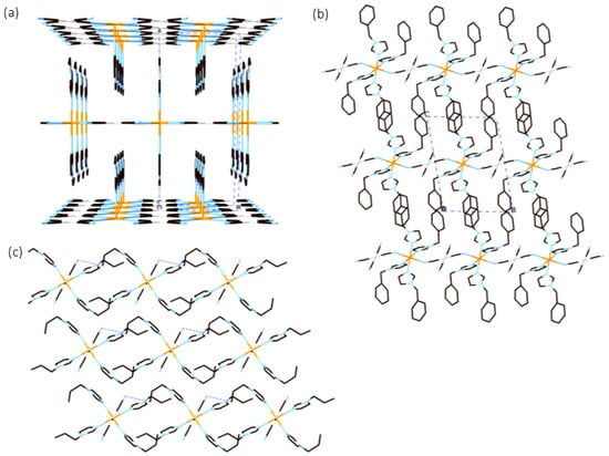 View of crystal structures of 1 (a), 2 (b), and 3 (c). Hydrogen atoms are omitted for clarity. Blue dotted lines indicate C–H⋯NCN interactions between adjacent 1D coordination polymers.