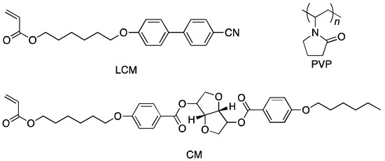 Molecular structures of liquid crystal monomer (LCM), chiral monomer (CM), and dispersion stabilizer (PVP).