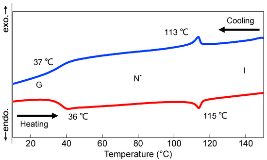 We successfully obtained monodisperse polymer particles with an average diameter (d) of ~2.5 μm and a standard deviation of 0.1 μm at ~50% conversion (Table 1). SEC analysis revealed a number-average molecular weight (Mn) of 15,000 Da and a polydispersity index of 2.6 (Table 1). The copolymer composition was determined using 1H NMR spectroscopy, which confirmed that the desired copolymer with the same composition as that of the monomer mixture for polymerization was achieved (Table 1 and Figure S2). DSC measurement indicates that the synthesized polymers had a glass transition temperature (Tg) at 36 °C and showed a liquid–crystalline phase up to 115 °C in the heating process (Figure 2). These results demonstrate that our N* LC particles were solid at room temperature, wherein the helical alignment of the mesogens in the N* LC phase was fixed within the solid particles.