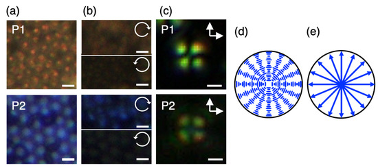 Microparticles with red (P1) and blue (P2) reflection colors were prepared by controlling the molar ratio of the CM (Figure 3a). Observations through CPL filters revealed that right-handed CPL was reflected by N* LC particles (Figure 3b) [18]. As in our previous report, we considered that the helical axes aligned radially within the particles, as evidenced by the Maltese cross-pattern observed using polarized optical microscopy (POM, Figure 3c) [19]. The idealized molecular and helical axis alignments are schematically illustrated in Figure 3d and Figure 3e, respectively.