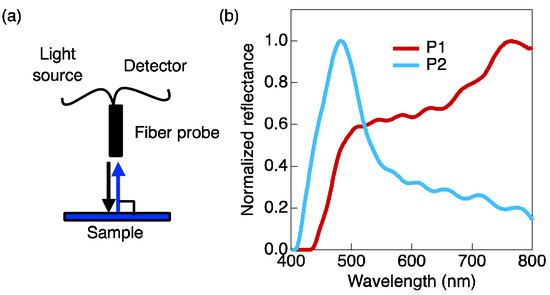 Reflection spectra were measured using a diode array spectrometer (BLUE-WaveUVN, StellarNet, Tampa, FL, USA) equipped with two types of fiber probes. A coaxial fiber probe (R600, StellarNet, Tampa, FL, USA) was employed to measure the normal reflection. To investigate the incidence angle dependence, two uniaxial fiber probes (F400, StellarNet, Tampa, FL, USA) were used. In this study, the incidence angle (θ) was defined as the angle between the substrate surface plane and the incident light, which was controlled by the fiber probe connected to the light source. The fiber probe connected to the detector was fixed perpendicular to the substrate surface. A tungsten lamp (SL-1, StellarNet, Tampa, FL, USA) served as the incident light source for unpolarized white light. To evaluate the differences in wavelengths, each spectrum was normalized by dividing the original data by the corresponding intensity value at the maximum reflection wavelength in the measured ranges.