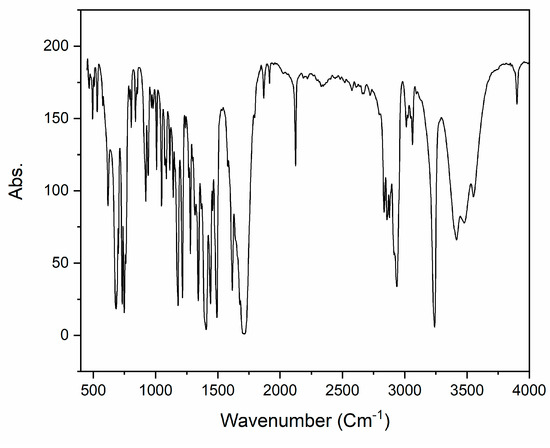The infrared (IR) spectrum of 2 (KBr pellet, cm−1) reveals prominent characteristic peaks, as illustrated in Figure 2. Specifically, the CH2 group exhibits a notable peak at 2930 cm−1, the C−N stretch appears at 1404 cm−1, while other distinctive groups, such as the C=O stretch and the C≡C triple bond, are observed at 1710 cm−1 and 2125 cm−1, respectively. For a more comprehensive understanding, the theoretical IR spectrum was computed using the B3LYP/6-311++G(d,p) level in the gas phase and is presented in Figure 2. The most important experimental and calculated harmonic stretching frequencies are listed in Table 1. Comparing the values, it is evident that the theoretical FT-IR, derived from the same basis-set calculations, generally aligns well with the experimental data, as summarized in Table 1.