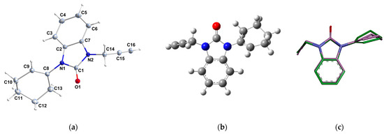 (a) ORTEP of compound 2 at a 50% probability level (only the major disorder component is shown), (b) optimized structure of compound 2, and (c) superimposition of the X-ray structure (green) and the optimized structure (magenta) on the studied molecule 2.