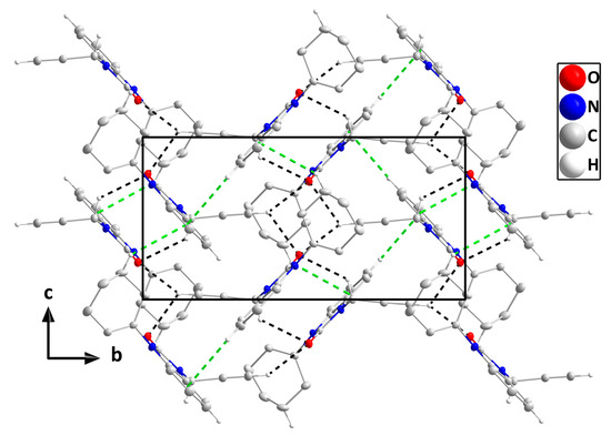 A portion of one layer, observed along the a-axis orientation, illustrates C-H···O hydrogen bonds and C-H···π(ring) interactions denoted by black and green dashed lines, respectively. For clarity, hydrogen atoms with no interaction are omitted from the representation.