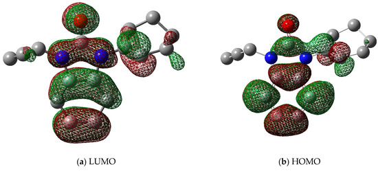 A molecule with a large gap (∆E) (i.e., the highest occupied molecular orbital (HOMO) minus the lowest unoccupied molecular orbital (LUMO)) has generally a high kinetic stability and a low chemical reactivity (Figure 6) [28]. In terms of the energetic stability of a molecule, it is unfavorable to add electrons to a high-lying HOMO and to remove electrons from a low-lying LUMO. Table 5 shows the calculated molecular reactivity parameters for the title molecule, including electronegativity (χ), ionization potential (IP), chemical potential (μ), chemical hardness (η), chemical softness (S), and electron affinity index (EA).