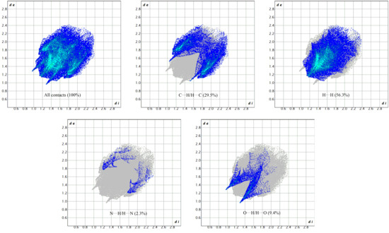 Dominant interactions within the HS are corroborated by the fingerprint diagrams, as illustrated in Figure 8, where one molecule acts as an acceptor (di > de) while the other functions as a donor (de > di). The 2D fingerprint diagrams, depicted in Figure 8, highlighted the prevalence of specific intermolecular contacts, with H‧‧‧H and C‧‧‧H interactions being the most prevalent in 2, constituting 56.3% and 25.5% of the total area, respectively. Other dominant forces are O‧‧‧H/H‧‧‧O (9.4%) and N‧‧‧H/H‧‧‧N (2.3%) contacts for (2). The presence of π-π-stacking-type interactions in the shape index is corroborated by the flat green surface, delimited by a blue hump close to the red hollows, as well as a blue outline on the curvedness surface. The 2D fingerprint plots and the molecular HS regions are useful in clarifying the contributions of the different inter-contacts that participate in the stabilization of the crystal structure. These contributions indicate that the arrangement of 2 is predominantly influenced by the robust electrostatic interactions that drive the crystal-packing force in 2.