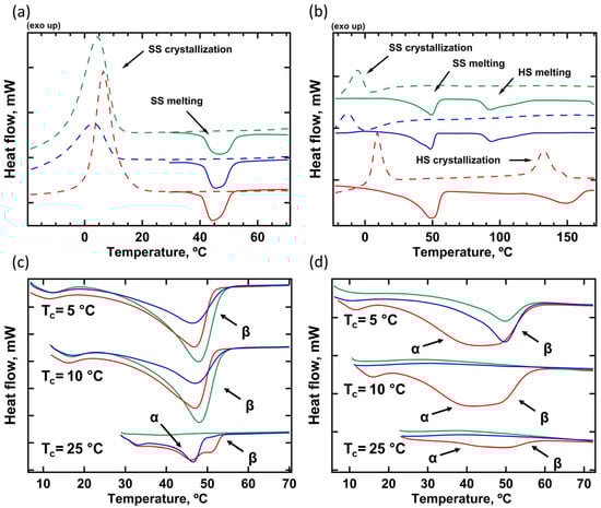 DSC curves TPU(PBA) (green), TPU(PBA-MDI) (blue), and TPU(PBA-HMDI) (red): (a) first heating to 80 °C (solid lines) and cooling to −45 °C (dashed lines); (b) second heating to 180 °C (solid lines) and cooling to −45 °C (dashed lines); (c) heatings after cooling from 80 °C and isothermal crystallization at Tc = 5, 10, and 25 °C; (d) heatings after cooling from 180 °C and isothermal crystallization at Tc = 5, 10, and 25 °C. The arrows indicate melting of the α- or β-polymorph of PBA.