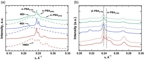 WAXS of TPU(PBA) (green), TPU(PBA-MDI) (blue), TPU(PBA-HMDI) (red): (a) native at RT (solid) and at 80 °C (dashed); (b) at RT after cooling from 80 °C (solid) and 180 °C (dashed). Vertical lines indicate positions of characteristic peaks of β- and α-phase of PBA.