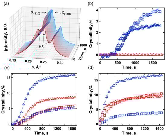The analysis of the crystallization kinetics of the TPUs at RT was performed with in-situ SAXS/WAXS by employing intense synchrotron radiation. The amount of the orthorhombic and monoclinic phases of PBA was estimated from the relative intensity of the reflections at s = 0.240 and 0.244 Å−1, respectively (Figure 3a). One can see that the growth rate and relative fraction of each polymorph depend on the composition of HS and the previous highest melt temperature (Figure 3b–d). The final crystallinity index and phase composition are shown in Table 4.