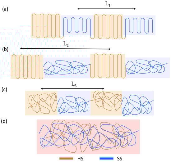 Schematic representation of the morphologies of the TPUs: HS crystal/SS crystal (a), structure after SS melting (b), amorphous phase-separated state (c), and amorphous isotropic state (d).