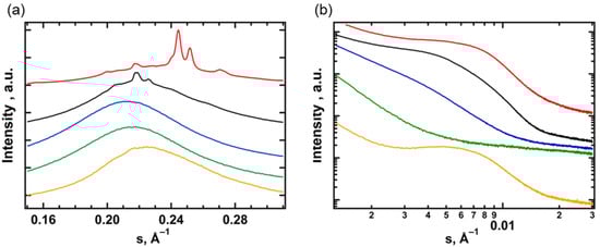 WAXS (a) and SAXS (b) curves for TPU(PBA-MDI) measured at RT (red), 80 °C (black), 180 °C (blue), 230 °C (green), and immediately after cooling from 230 °C to RT (orange).