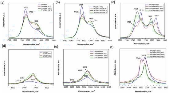 The incorporation of MDI into the PBA polymer chain (PBA-MDI) improves the phase-separated structure. This is evidenced by an increase in the shoulder of the H-bonded urethane segments at 1699 cm−1 for the native sample, as shown in Figure 6b (blue curve). This is further confirmed by the increase in the peak of hydrogen-bonded amide groups (3322 cm−1). However, the peak at 3443 cm−1 is still observed (Figure 6e, black curve). Analogous to TPU(PBA), heating to temperatures of 80 and 180 °C improves the phase separation in TPU(PBA-MDI), as displayed in Figure 6b,e (red and black curves).