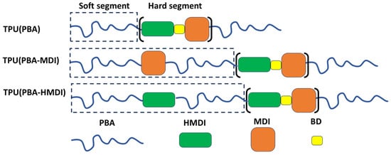 where M(polydiol), M(MDI + HMDI) and M(BD) are the molecular weights of the PBA, diisocyanate, and chain extender, respectively; n is the number of moles of BD. The chemical structure of the synthesized TPUs is presented in Scheme 1.