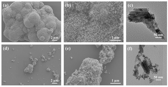 SEM images of ε-MnO2-B (a,b) and ε-MnO2-P (d,e); TEM images of ε-MnO2-B (c) and ε-MnO2-P (f).