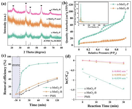 (a) XRD patterns of ε-MnO2-B and ε-MnO2-P (before and after reaction), (b) N2 adsorption–desorption isotherms of ε-MnO2-B and ε-MnO2-P, (c) CIP removal efficiency in different oxidation systems, and (d) the pseudo-first-order kinetic linear fitting plots. Reaction conditions: [CIP] = 10 ppm, [Catalyst] = 0.2 g/L, [PMS] = 1 mM, without pH adjustment.