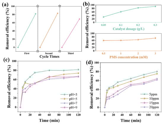 To further study the influence of different environmental factors on the catalytic performance of ε-MnO2-P, the effects of different catalyst dosages, PMS concentrations, solution pH values and initial CIP concentrations on the CIP removal efficiency are compared. Figure 3b expresses the impact of catalyst dosage and PMS concentration on CIP removal efficiency. It can be clearly observed that, as the catalyst dosage increases from 0.05 to 0.3 g/L, the removal efficiency of CIP significantly increases, and the maximum removal efficiency reaches 91.5% within 60 min. It is worth noting that the increase in catalyst dosage from 0.2 g/L to 0.3 g/L results in only a slight change in the CIP removal efficiency. This phenomenon should be due to excess active sites not being effectively utilized as the amount of PMS is limited or the agglomeration of active sites occurring at high catalyst concentrations. In addition, increasing the PMS concentration alone can only slightly enhance the removal effect, indicating that a PMS concentration that is too high is not conducive to CIP removal.