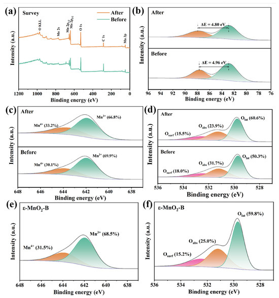 XPS spectra of ε-MnO2-P: (a) survey (full spectrum), (b) Mn 3s, (c) Mn 2p, and (d) O 1s. XPS spectra of ε-MnO2-B, (e) Mn 2p, (f) O 1s.