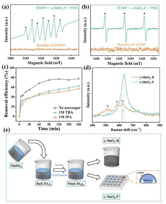 EPR spectra of ε-MnO2-P in the presence of different trapping agents: (a) DMPO and (b) TEMP. (c) Plots of CIP removal efficiency after the addition of different trapping agents. (d) Raman spectra of ε-MnO2-P and ε-MnO2-B. (e) Schematic diagram of the preparation process of ε-MnO2-B and ε-MnO2-P.