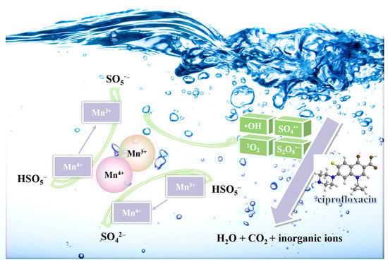 Taken together, the conclusions regarding the influencing factors of SR-AOPs for the removal of CIP have been discussed and validated. Since the catalytic activity of the two ε-MnO2 materials differs considerably, the preparation process of the material is shown to explain the synthesis mechanism. As shown in Figure 5e, when Mn(ClO3)2 solution was added to the hydrophobic PTFE plate in the form of liquid droplets, as drying proceeded, the surface of the droplet and the air contact preferentially decomposed to produce a MnO2 barrier layer. The decomposition process proceeded according to the equation Mn(ClO3)2 → MnO2 + 2ClO2↑. With continuous drying, a microcavity anoxic space was generated inside the isolation layer; ultimately, the oxygen vacancies in the prepared ε-MnO2-P increased, resulting in high catalytic activity. According to the abovementioned results, we hypothesized the mechanism of ε-MnO2-P removing CIP, and the diagram is shown in Figure 6. First, Mn3+ and Mn4+ formed a unique redox cycle, and the electron transfer generated during the cycling process promoted the conversion of HSO5− to ·OH, SO4·− and SO5·− through Equations (1)–(3). Of these, SO5·− was only produced when high-valent manganese reacts with HSO5−, which is one of the reasons why ε-MnO2-P with a higher proportion of low-valent manganese exhibits a better removal effect. In addition, SO4·− also reacted with water to form ·OH via a free radical chain reaction, which revealed a slight effect on the overall pH range of the reaction [37]. Meanwhile, 1O2 was produced through the interaction of ·OH and ·OH, or the combination of HSO5− with SO52− (another form of PMS) [19,38].