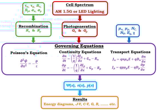 SCAPS flowchart demonstrating the contained input factors and the principal semiconductor equations invoked in simulations.