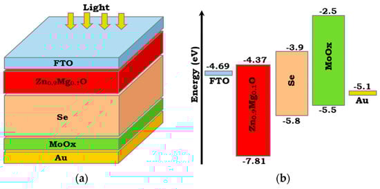 FTO/ETL/Se/HTL/Au cell configuration: (a) major layers (Zn0.9Mg0.1O serves as an ETL and MoOx acts as an HTL), and (b) energy band diagram before contact clarifying the accompanying energy levels of each layer.