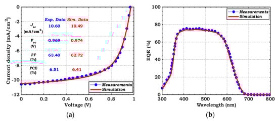 Simulation model calibration versus experimental data [16]: (a) illuminated (AM1.5G) J–V curves, and (b) EQE spectra.